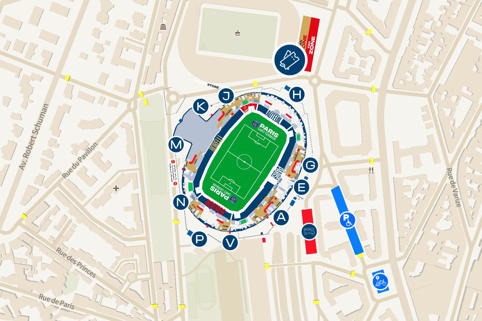 Grâce à une interface simple et intuitive, le plan interactif répertorie tous les points d’intérêt du Parc des Princes :