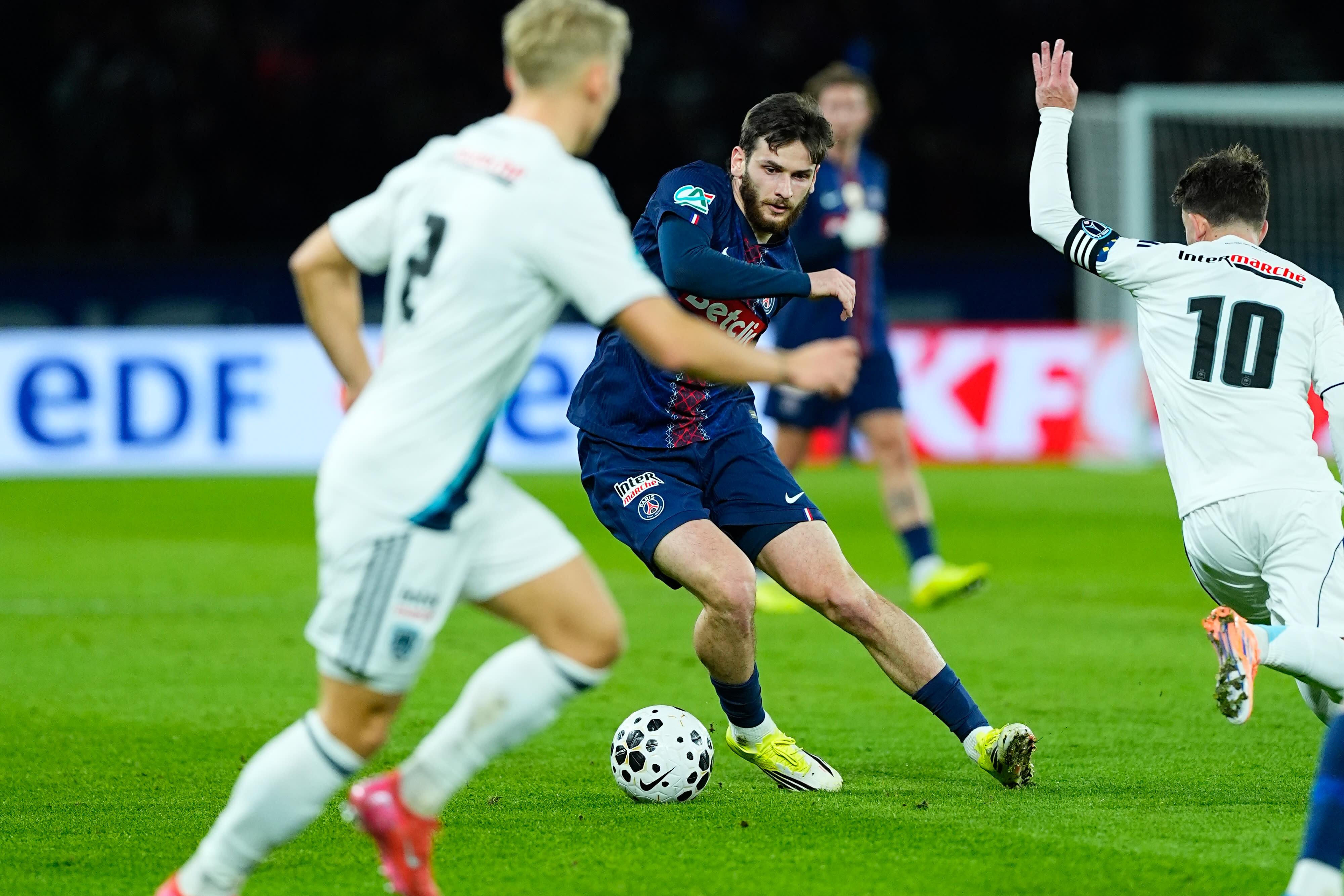 Tranchant en contre-attaque, les hommes de Stéphane Gilli parviennent à faire parcourir les premiers frissons dans les travées du Parc des Princes à l'orée du quart d'heure de jeu. Il en faut toutefois plus pour tromper un Lucas Chevalier toujours impérial sur sa ligne, se couchant parfaitement sur la tentative d'Alimani Gory (13e). La réponse ne tarde pas du côté de nos Rouge et Bleu. Coup sur coup, Obed Nkambadio sauve les siens en détournant du bout des doigts un centre-tir trompeur de Bradley Barcola (23e) et un tir audacieux de Gonçalo Ramos (24e). Malgré une nette domination et deux nouvelles tentatives signées Senny Mayulu (36e) et Khvicha Kvaratskhelia (45e+1), les Rouge et Bleu ne parviennent pas à faire la différence avant la pause.