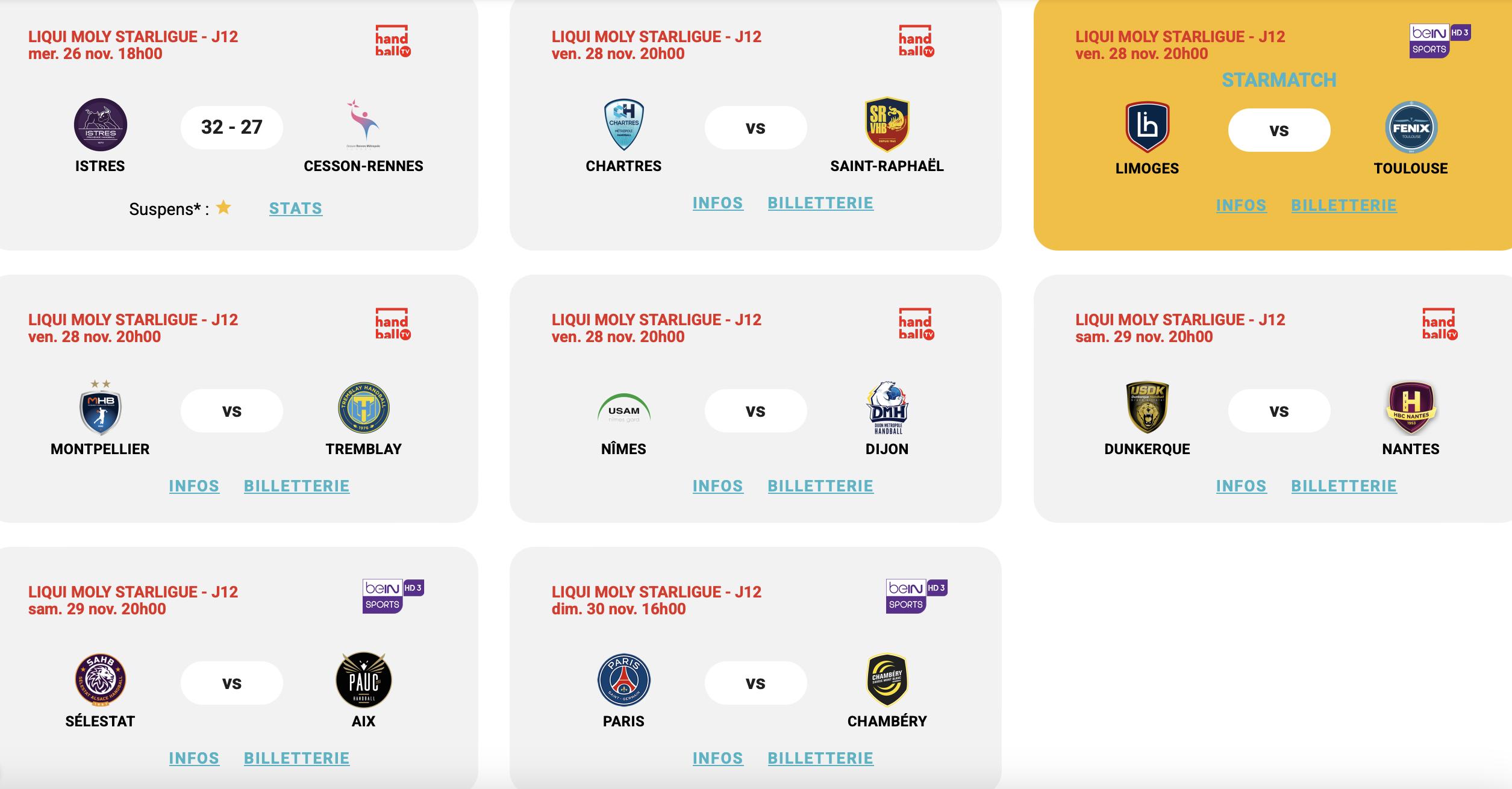 Cette rencontre entre Paris et Chambéry viendra clore une 12e journée qui a déjà commencé mercredi, avec la victoire d’Istres face à Cesson-Rennes (32-27). Ce vendredi 28 novembre, Nîmes et Chartres accueilleront respectivement Dijon et Saint-Raphaël. La soirée sera aussi l'occasion de voir deux chocs de haut de tableau, avec Montpellier qui tentera de se relancer face à Tremblay, et l'affrontement attendu entre Limoges et Toulouse.