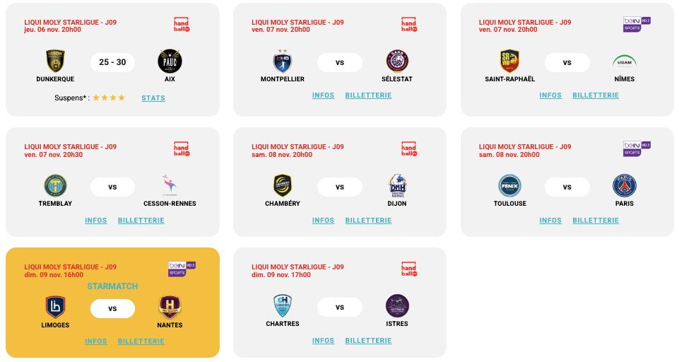 Dans le même temps, Nîmes tentera de mettre fin à sa série de quatre revers consécutifs lors de son déplacement à Saint-Raphaël, tandis que Tremblay et Cesson-Rennes s’affronteront à l’occasion d’un choc entre deux candidats surprise à la course à l’Europe. Samedi soir, Dijon tentera de poursuivre sur sa bonne dynamique après avoir décroché sa première victoire de la saison avant la trêve. Pour cela, il faudra faire un grand match au Phare de Chambéry. Enfin, dimanche, Nantes se déplacera à Limoges dans le StarMatch de cette 9e journée avant que Chartres et Istres concluent cette semaine de reprise.