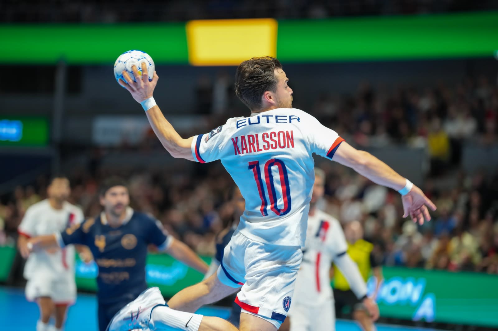 Sebastian Karlsson finit par offrir un premier break aux Rouge et Bleu (6e : 3-5). Les locaux tiennent tête au leader du championnat, mais ce dernier est porté par une énorme performance de Yahia Omar dans cette première période, qui réussit presque tout ce qu'il entreprend (3 buts, 5 passes). Avec sept arrêts, Jef Lettens empêche les Parisiens de complètement s'envoler, son équipe parvenant à rester au contact (18e : 10-11).